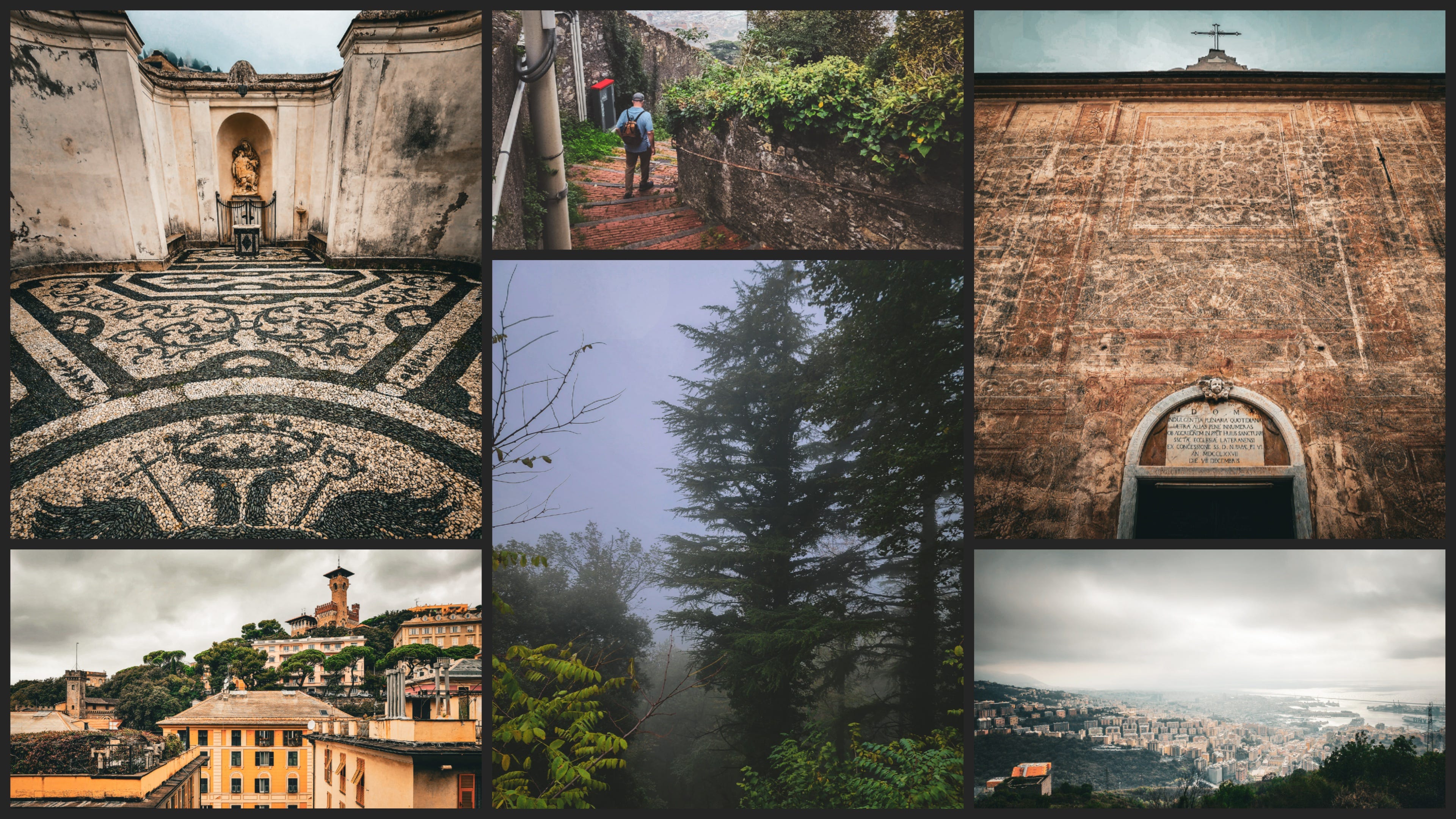 From the Columbus monument near the train station — A Cristoforo Colombo / La Patria, cut in marble, bronze wreaths gone green at the base — we took the Zecca-Righi funicular up to the old defensive walls above the city. Genoa spread below in haze, the port cranes and the Ligurian Sea dissolving into a single gray wash. The walls ran through fog and cedar trees. A medieval gate appeared along the path with Osteria da Richetto built into it. We ate and drank.