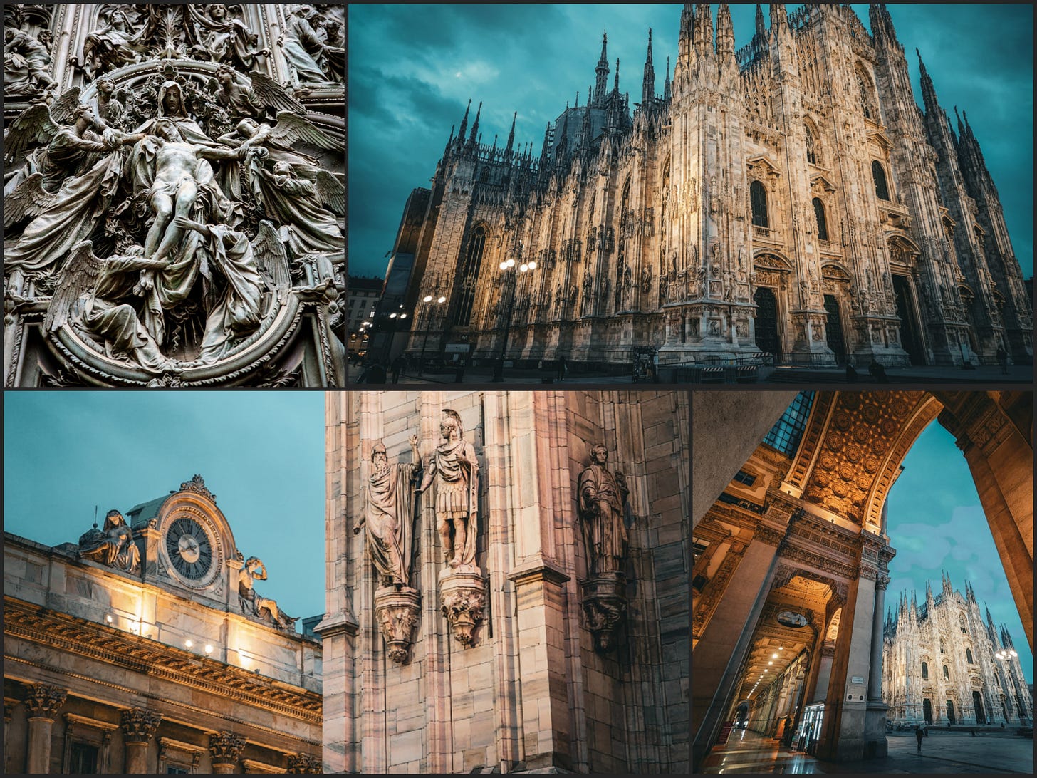 The vagrants and tourists don’t arrive until eight. I went out at six-thirty. The Piazza del Duomo was empty. The Duomo faced the square from the east, flood-lit from below, white marble against a sky still closer to night than morning. The five great doors were shut. They laid the first stone of this Cathedral in 1386. Six centuries. You stand there doing the arithmetic and it does not resolve. 1386. Before the printing press, before Columbus.