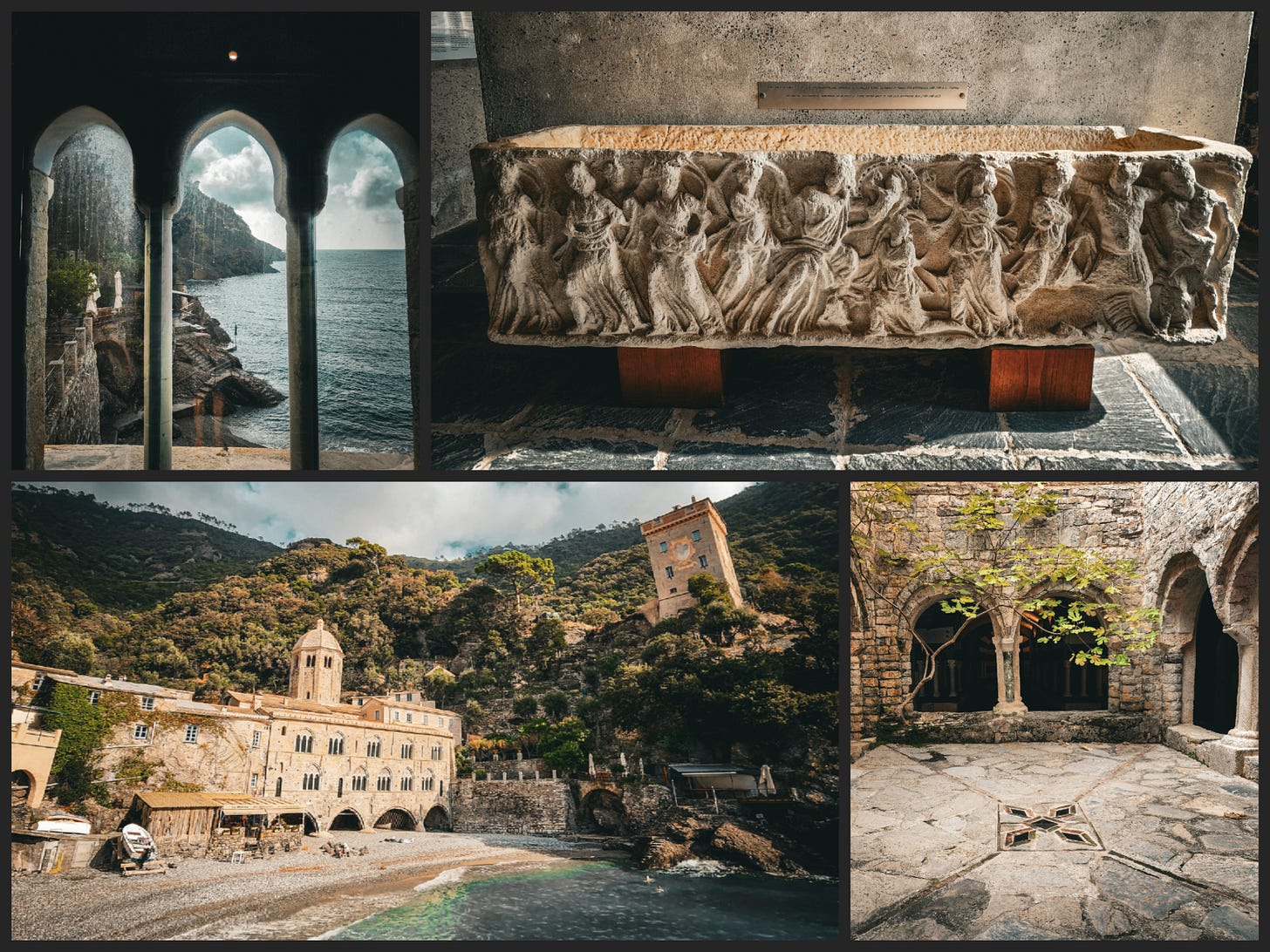 We took the train to Camogli and the ferry from there to San Fruttuoso. The abbey appeared around the headland — Gothic arches opening onto the water, a Doria watchtower above in the trees. No road reached this place. The mountain closed around the cove on three sides, the sea on the fourth. Off the cloister, a Roman sarcophagus sat on wooden blocks.