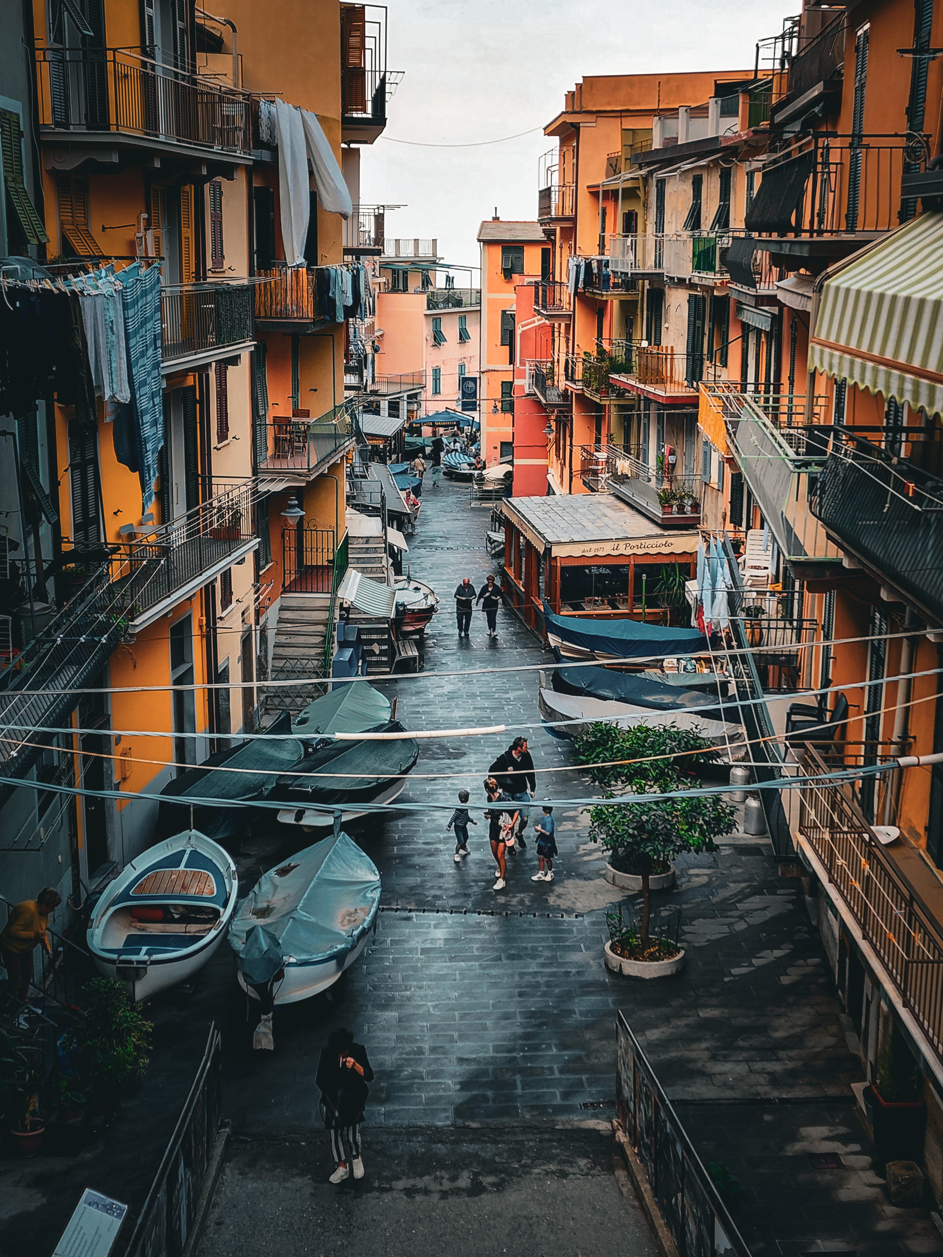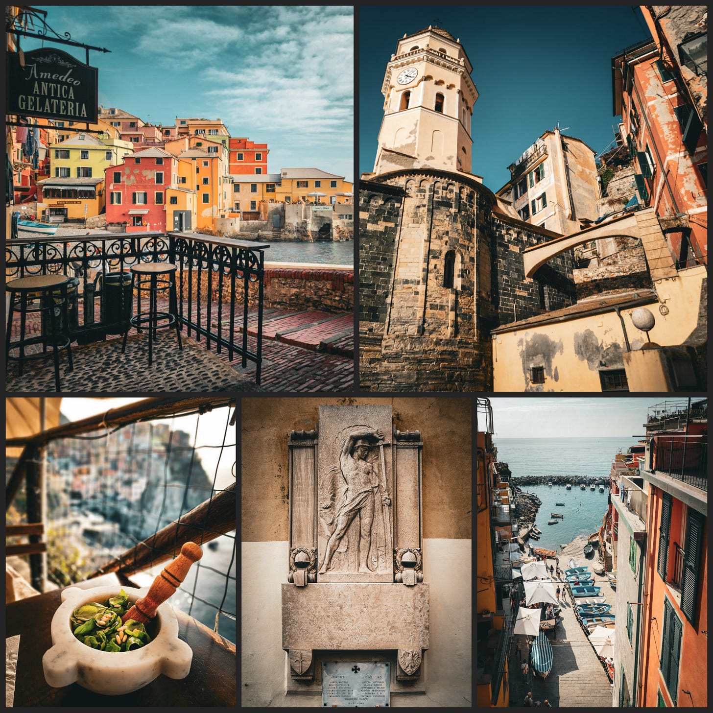 My wife and I took the train south to the Cinque Terre. At Manarola the main street ran downhill from the station to the harbor like a long boat ramp. At Nessun Dorma, on a cliff above the village, we made pesto. At Vernazza a church rose straight from the waterline, built from the same stone as the seawall. Above Riomaggiore, terraced vineyards climbed toward the ridge. We came back to Camogli for dinner. I had caviar pasta and a Negroni. The pasta lives rent free.