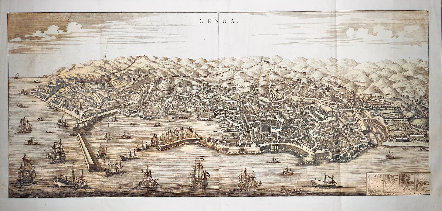 The Genoese drew portolan maps, financed ships, kept accounts. When the Ottomans took Constantinople in 1453, Genoese bankers turned west and underwrote Spain’s American empire. By the 1550s they held half the loans to the Spanish Crown. American silver moved through Genoa to Flanders. The families who controlled that trade built their palaces on a single street of marble and fresco, the Strada Nuova.