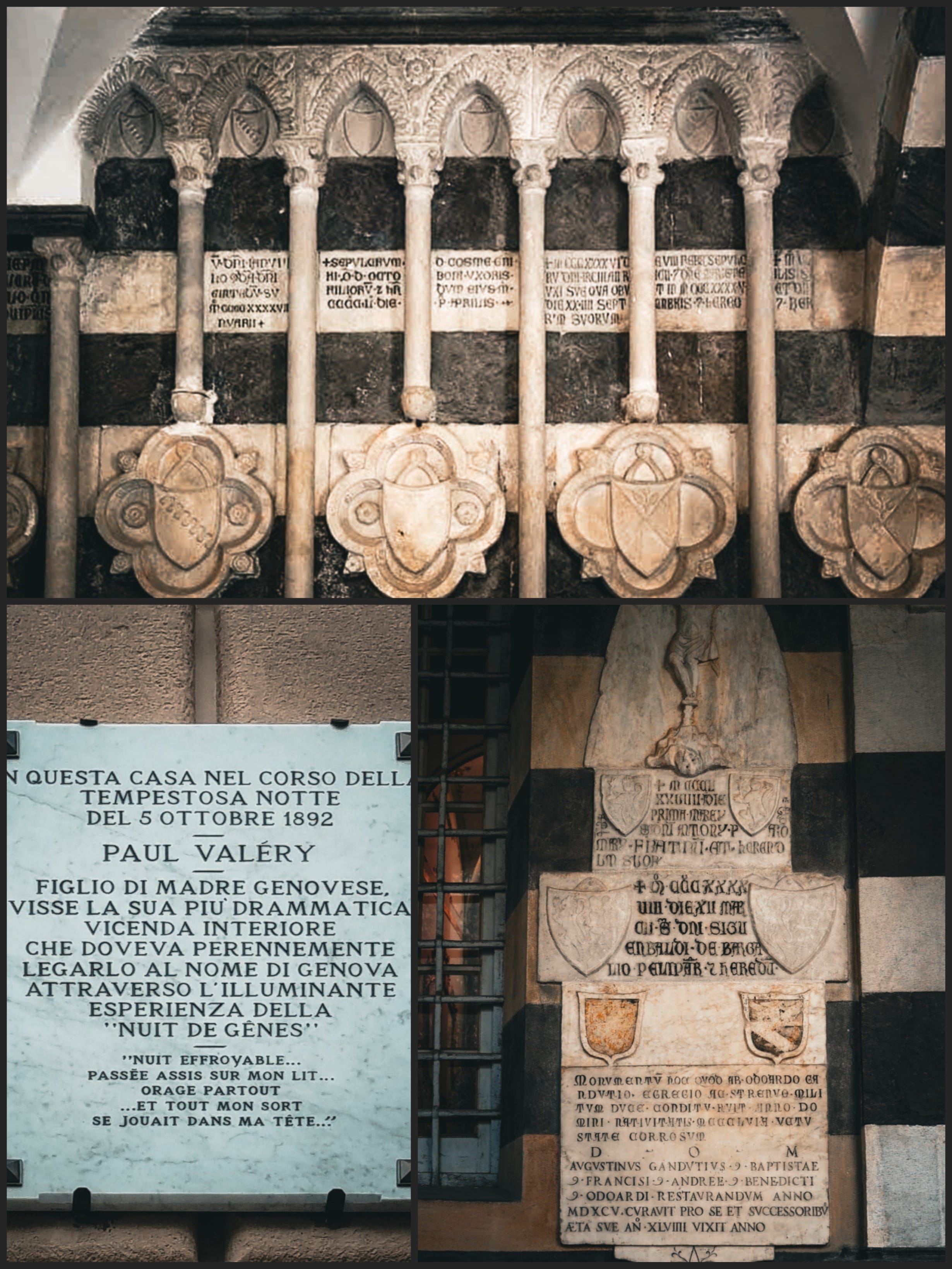 We arrived at Genova Piazza Principe on Saturday. Our hosts brought us to our Bed & Breakfast, the Valéry Guest House. The stairs rose between the Palazzo Grimaldi della Meridiana and the Musei di Strada Nuova. We climbed to a modest door, then a few steps more, and the space opened into an atrium, Latin inscriptions cut into black-and-white marble walls and columns that marked every building of consequence in medieval Genoa.