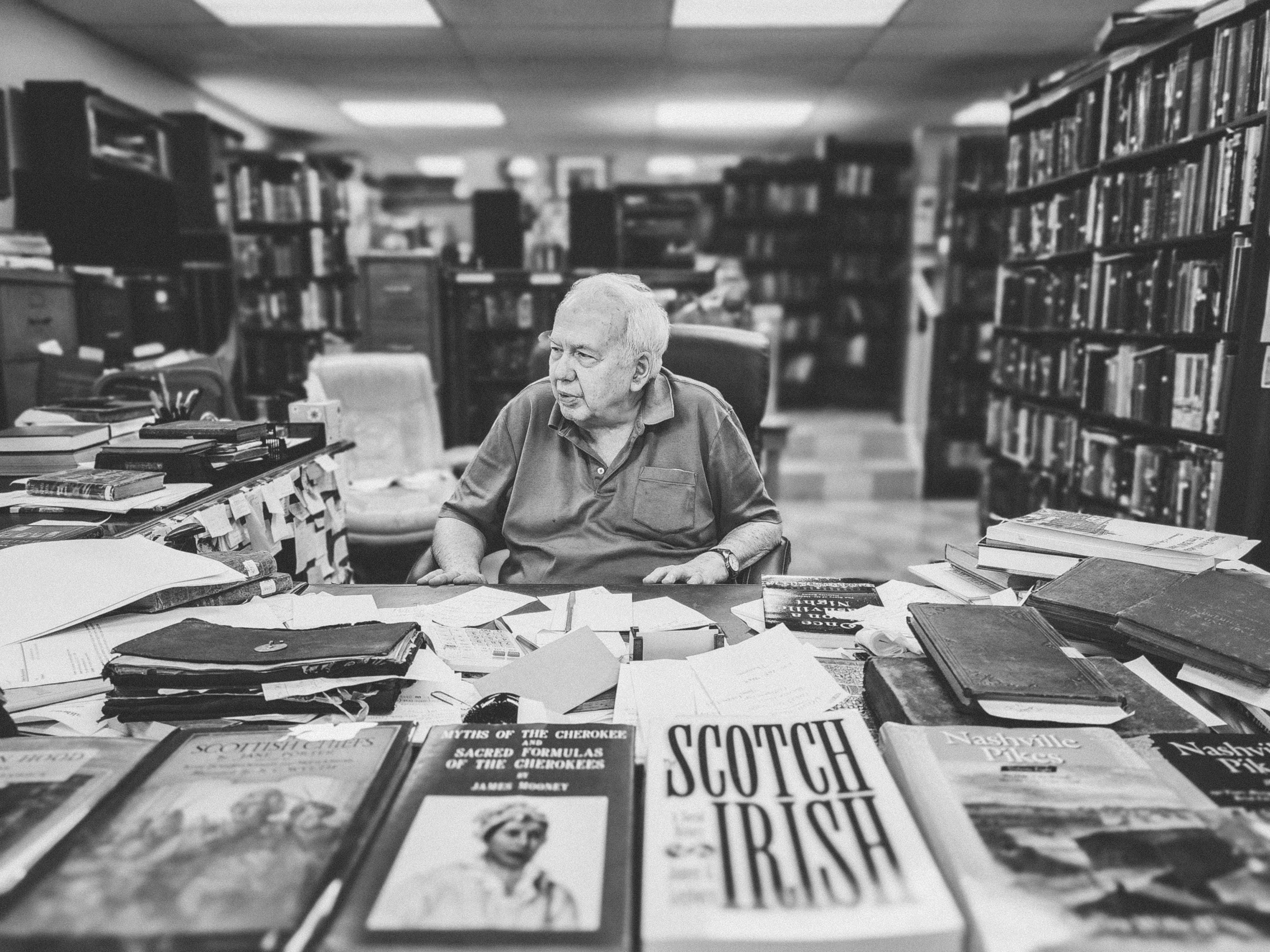 To the left, a few steps in, sits Randy Elder, the second-generation owner of the place. His desk is a Cumberland point bar where the current slows and the cultural sediment of a bookman’s trade collects. Scraps, notes, slips, and lists advance unchecked, creeping as vines will. Books crowd the edges. Cherokee myths, Scotch-Irish migrations, the roads of Nashville.